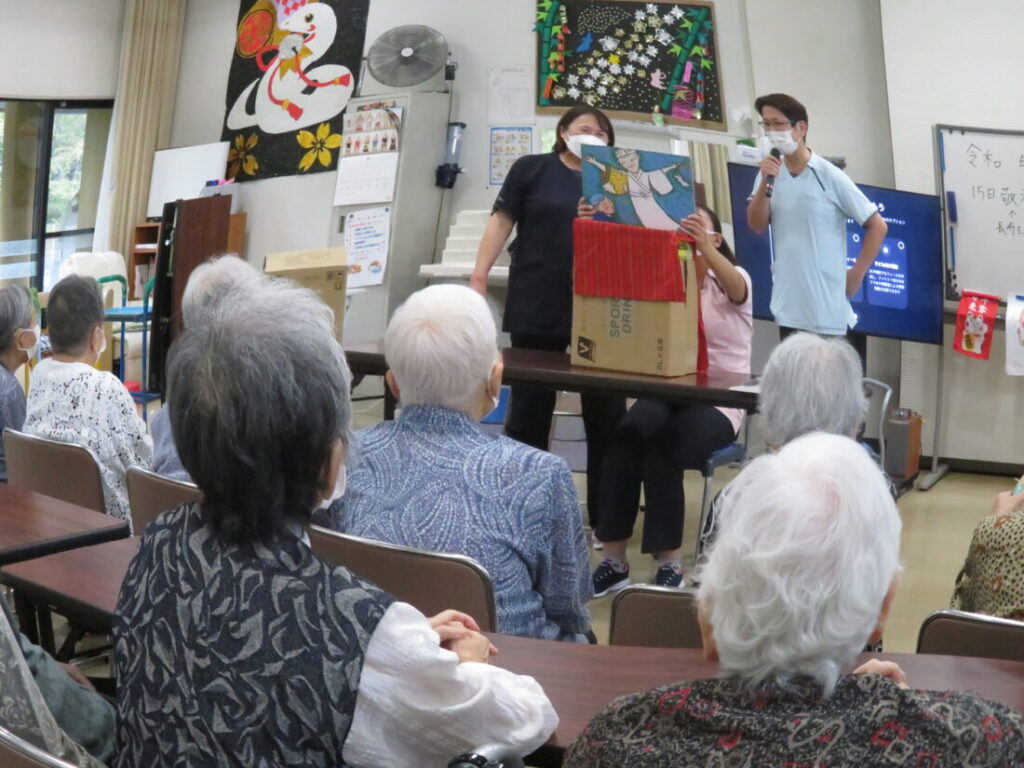 くじを引いて出たお題を行い当ててもらうゲーム♪職員たちもなにをしているか分からないのでとても楽しめました♪ちなみに、赤い靴のお兄さんは何をしているのかな??( *´艸`)