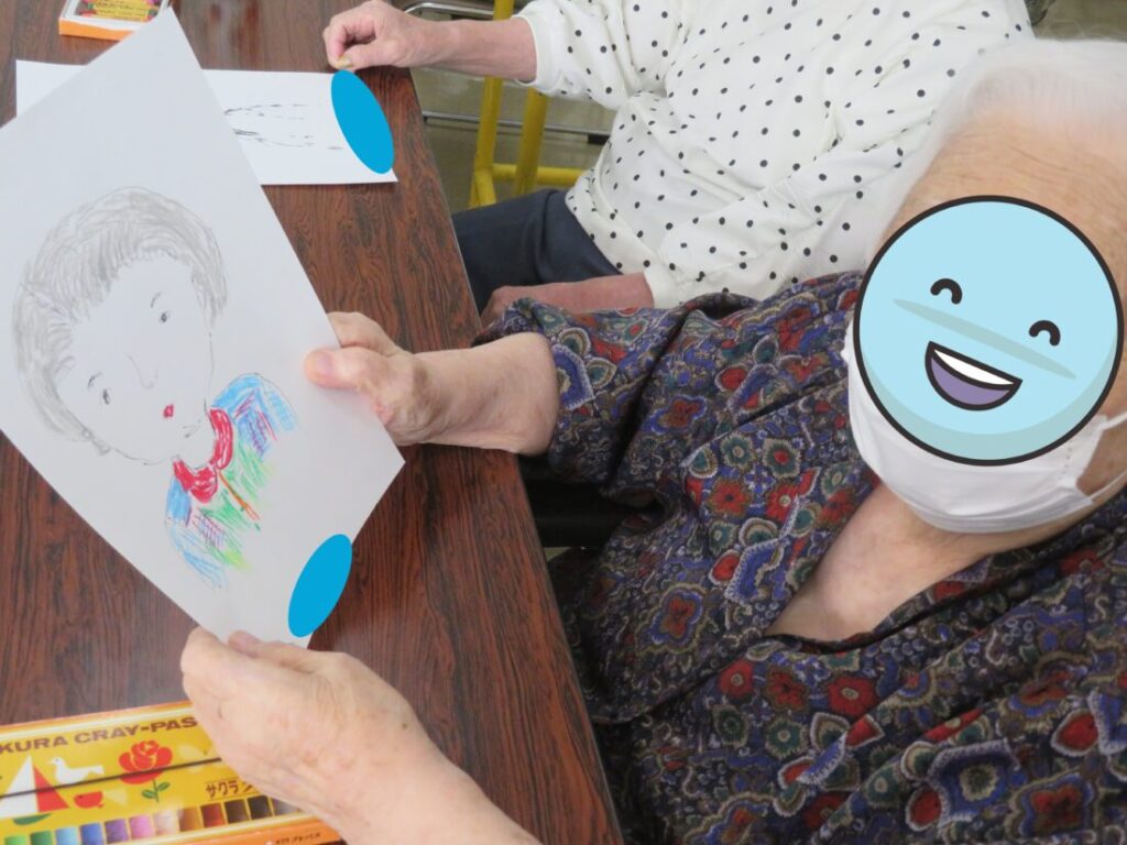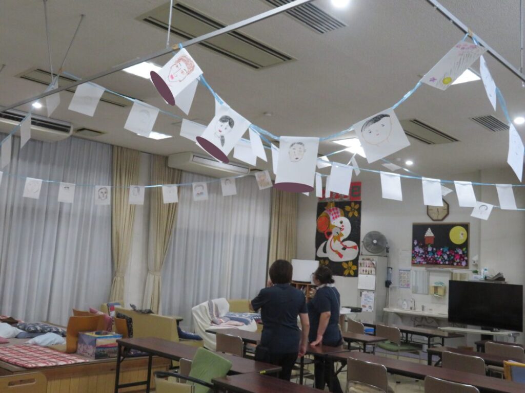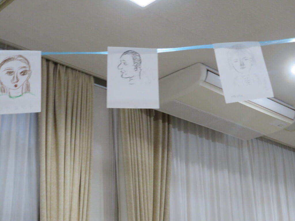 みんな鏡を見ずに自分の特徴をつかんで描いてから飾り付けをした後は、自分の描いた絵は「どこかな~?」って探したりしていました(^^)