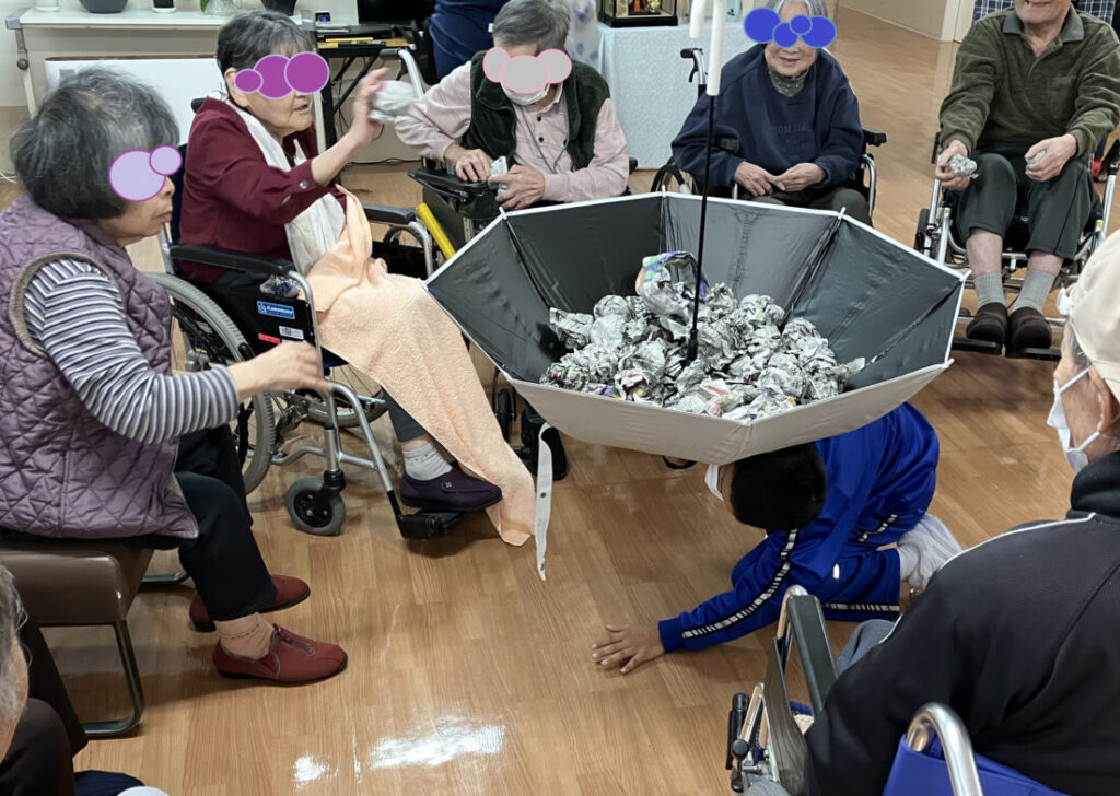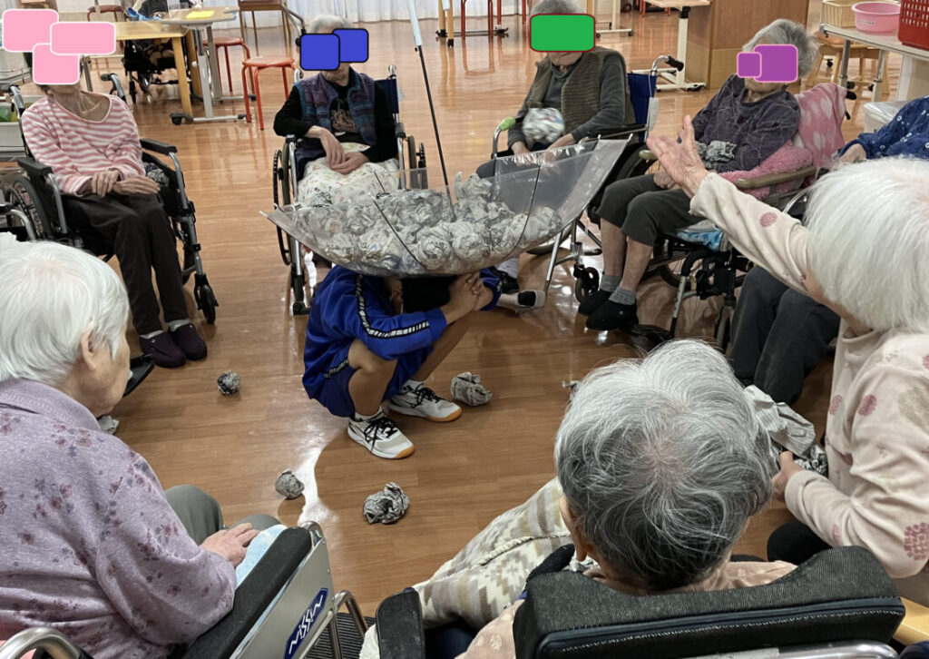 最初に配った玉はあっという間に投げ入れてしまい、利用者さんたちから「玉ないよ!」「こっちにもちょうだい!」と声が掛かり玉拾い・玉配りに息を切らす職員😵