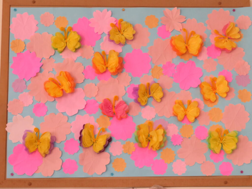 花と蝶を作って貼りました♪かわいらしい感じにできましたよ~!!「うわ~!家でも飾りたいよ~!」と言ってくれる方もみえました。